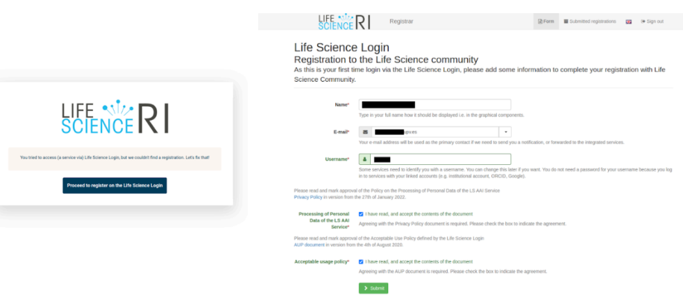 - Proceed to the registration of the user in the LS Login (figure 3). Provide your name, email, and a username, read the Privacy Policy and the Usage Policy of the LS-AAI service and click on the boxes confirming so.