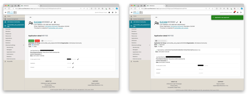 The creation of a LS-AAI account is a prerequisite to access EUCAIM restricted resources, but it does not grant access to them. In order to access the EUCAIM restricted resources, the user has to request membership to the EUCAIM Group. This process is manually verified by the security team of the platform, checking that the account requests are not fake and requesting any additional information if needed. Requests will be registered in the LS-AAI platform.