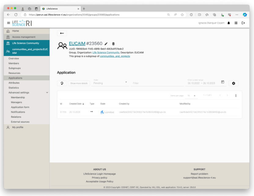 - A membership to the EUCAIM group will have been created (figure 2). This should be manually verified and accepted or rejected (figure 3) by the administrator of the EUCAIM group (NOTE: these screenshots are not available for the user, just for the group administrator).