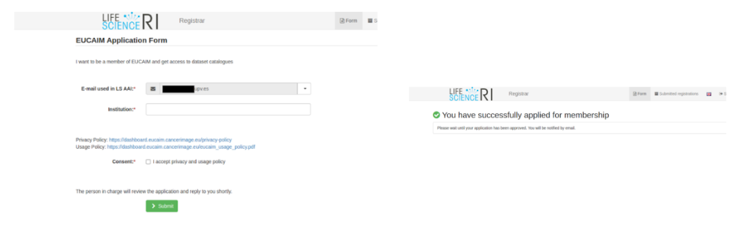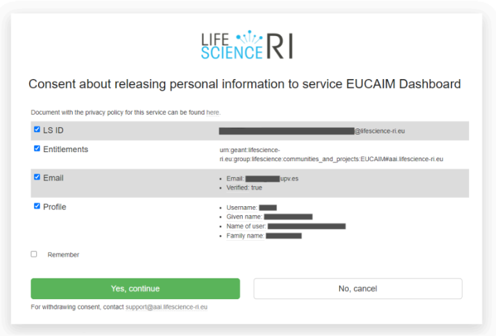 The creation of a LS-AAI account is a prerequisite to access EUCAIM restricted resources, but it does not grant access to them. In order to access the EUCAIM restricted resources, the user has to request membership to the EUCAIM Group. This process is manually verified by the security team of the platform, checking that the account requests are not fake and requesting any additional information if needed. Requests will be registered in the LS-AAI platform.